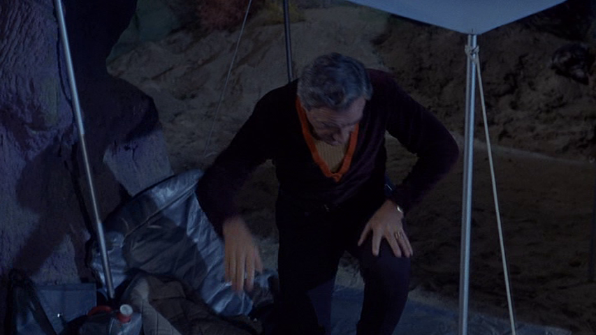 Smith sleeps under small tent at NIGHT. Will and the Robot are at a large