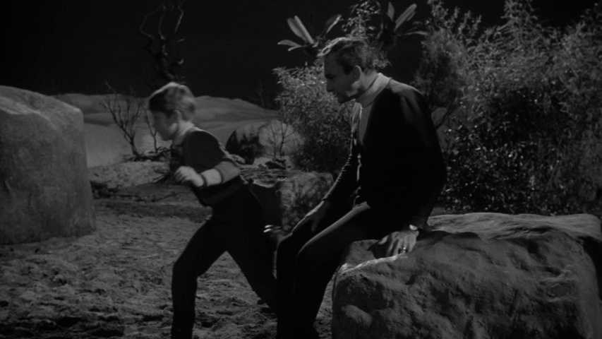 goes to him. Will says, "We've got to get back to the Jupiter II." They watch as the Trader returns. They run.